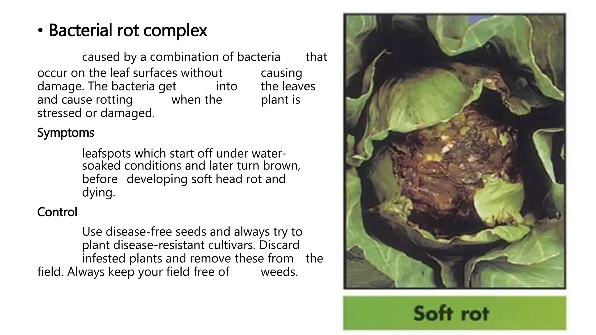 – **Bacterial Rot Complex**: Caused by a combination of bacteria that leads to rotting, particularly under stress conditions. Regularly discarded damaged plants and maintaining disease-resistant cultivars are recommended strategies.