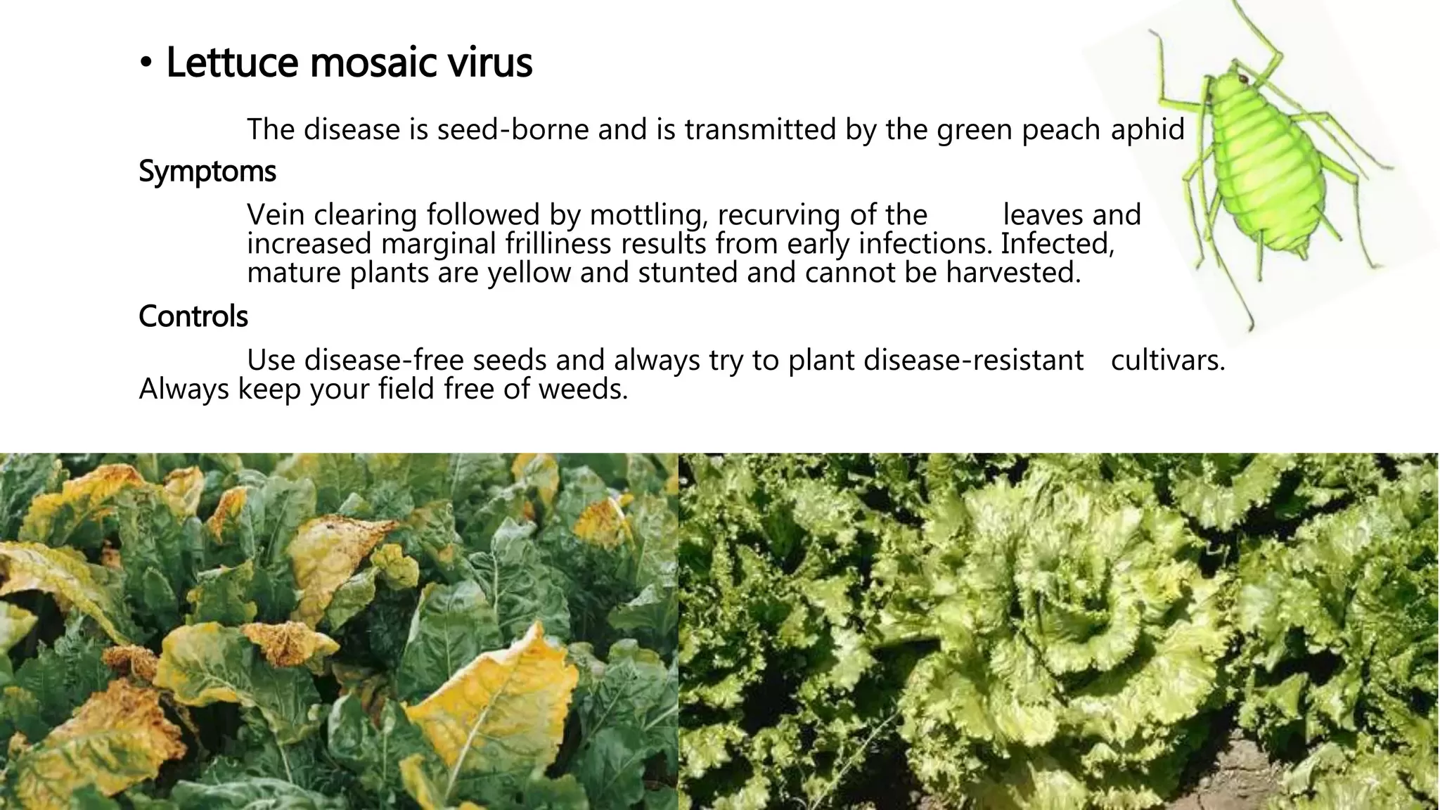Additional threats come from the **Lettuce Mosaic Virus**, which is seed-borne and transmitted through pests like the green peach aphid. Precautionary measures such as weed control and the use of resistant cultivars play a significant role in prevention.