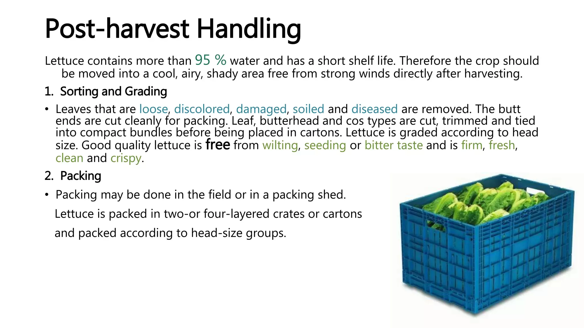 Post-harvest handling is equally important due to lettuce’s high water content (over 95%). Immediately after harvesting, the plants must be moved to a cool, shaded area. They undergo sorting and grading to remove damaged or diseased leaves, with packing typically done in two or four-layered crates for protection during transport.