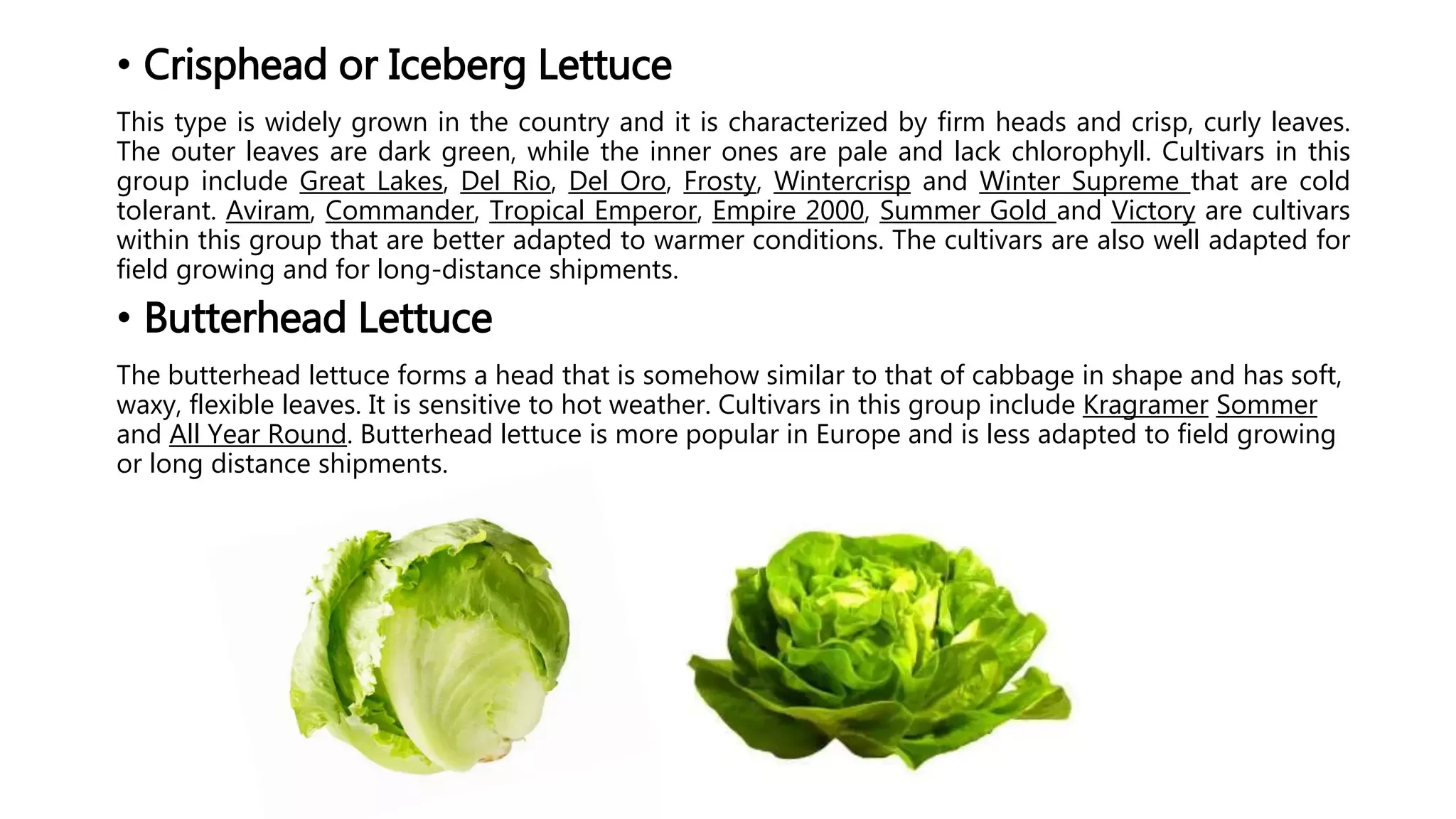 1. **Crisphead or Iceberg Lettuce**: This is the most widely grown variety, known for its firm heads and crunchy, curly leaves. The outer leaves are dark green, while the inner leaves are lighter and chlorophyll-deficient. Cultivars such as Great Lakes and Wintercrisp thrive in cooler conditions, while others like Empire 2000 are adapted to warmer climates.