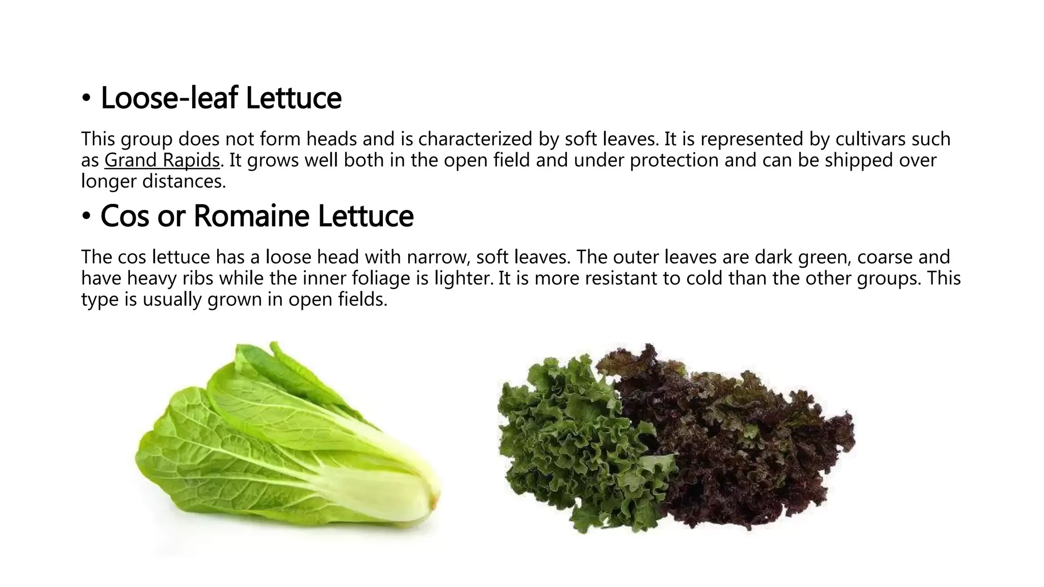 4. **Cos or Romaine Lettuce**: Characterized by their narrow leaves and looser heads, these lettuces possess dark green, coarse outer leaves that are particularly resistant to cold temperatures.