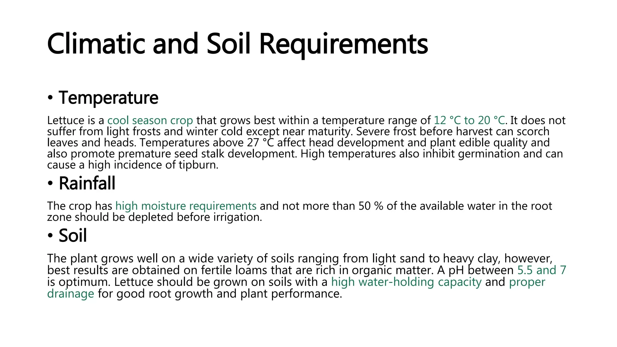 Lettuce thrives in cooler climates, preferring temperatures ranging from 12°C to 20°C. High temperatures, particularly those exceeding 27°C, can adversely affect head formation and lead to a decrease in the quality of the edible leaves. Soil-wise, lettuce flourishes in a variety of soil types but shows the best results when planted in fertile loams enriched with organic matter and maintaining a pH balance of 5.5 to 7. Proper drainage and high water retention are crucial in optimizing root growth.