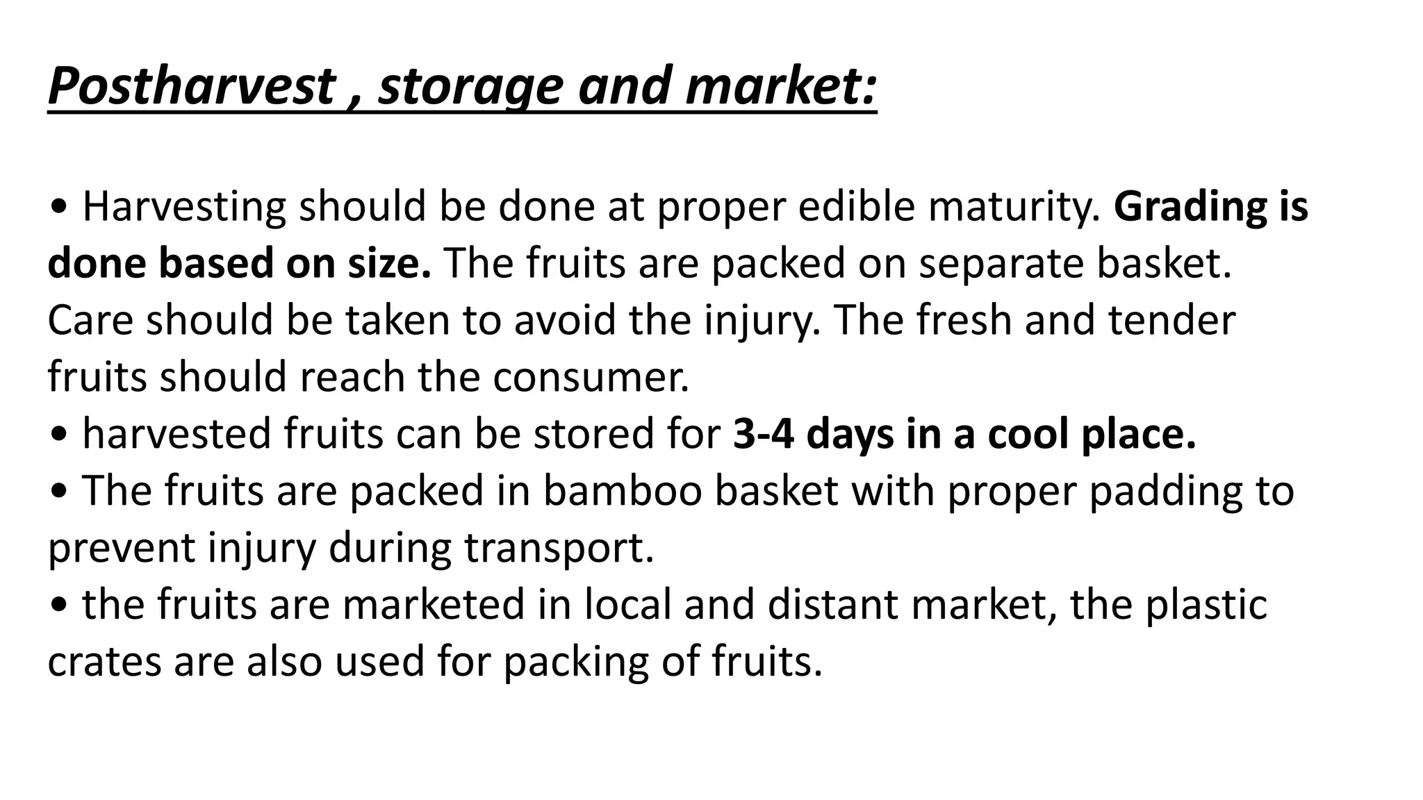• β€’ for export fruits should be picked at edible stage and kept in boxes pf 50-100kg capacity.
