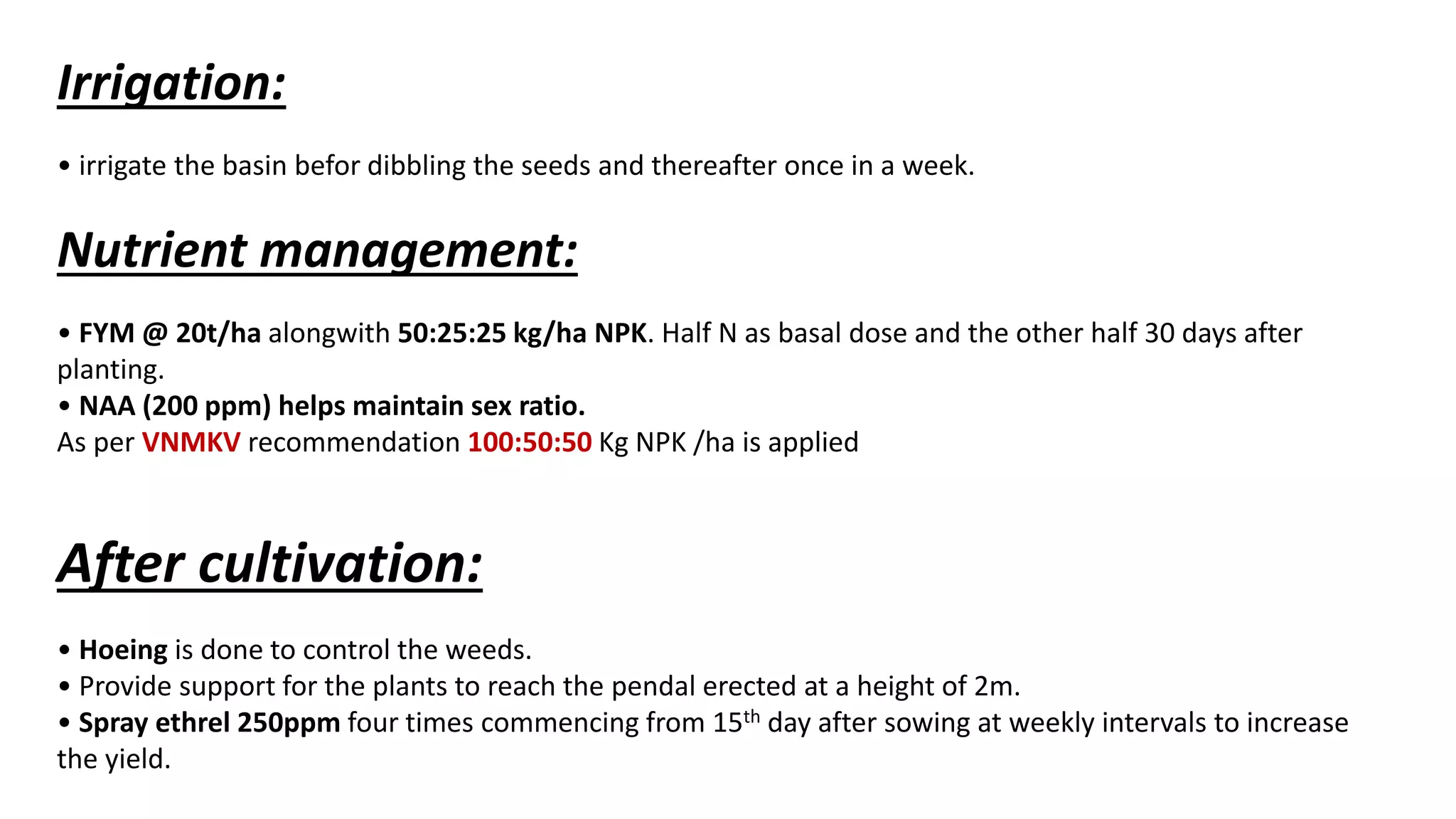 • Land preparation and sowing are similar to that of ash gourd. Land is ploughed to a fine tilth and furrows are
