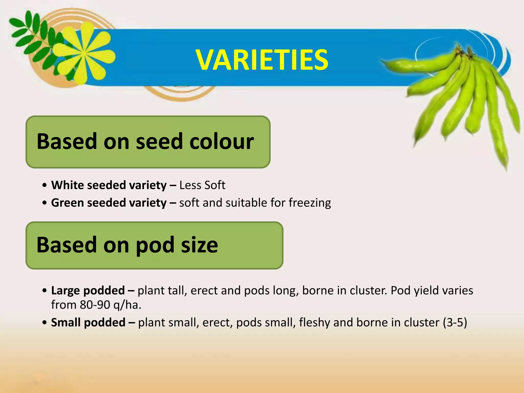 Broad bean, scientifically known as Vicia faba L., belongs to the Leguminosae/Fabaceae family and is commonly referred to by various names, such as faba bean, horse bean, and bakla bean. This versatile crop is predominantly cultivated in South America and Northern India, where it thrives in cooler temperatures. Recognized for its hardiness, the broad bean serves multiple functions beyond providing food; it is also valued as green manure and as a winter and autumn crop. The morphological structure of broad beans is distinctive, featuring square and erect stems that vary in height from 30 cm in dwarf varieties to about 100 cm in taller ones. The plants produce clusters of pods, typically containing five to seven pods, each about 15 cm long and 2 cm thick. These plants bear large and attractive flowers that are primarily pollinated by insects, contributing to their reproductive success. There are numerous varieties of broad beans, categorized based on seed color and pod size. Seed color varieties include white-seeded types that are less soft and green-seeded types that are suitable for freezing due to their softer texture. When considering pod size, large podded varieties yield higher, ranging from 80-90 q/ha, while small podded varieties display smaller, fleshy pods. Prominent improved varieties include Pusa Sumeet from the Indian Agricultural Research Institute in New Delhi, along with Masterpiece White Long Pod and Imperial Green Windsor, among others. Certain local selections, such as Jawahar Selection 73-31 from Madhya Pradesh and BR-1 and BR-2 from Bihar, demonstrate adaptability to regional growing conditions. Broad beans are particularly suited to cool climates, being the only crop that can be cultivated during winter and autumn. They can withstand low temperatures, even approaching -4°C, and are tolerant of temporary water stress due to the accumulation of proteins within the plant. Ideal soil for cultivation is well-drained, rich loamy soil with an optimal pH level between 6.5 and 7.5. Proper field preparation through repeated ploughing is essential to achieve fine tilth. Sowing of broad beans generally occurs between September to October and February to March, with a recommended seed rate of 70-100 kg per hectare. Seeds should be planted in shallow furrows spaced 75 cm apart, ensuring optimal growth conditions. Nutrient management is crucial, with a suggested application of 10 tons of farmyard manure per hectare, alongside nitrogen, phosphorus, and potassium fertilizer. Management practices also encompass irrigation and weed control, where light irrigation is carried out every 12-15 days and weeding is conducted at critical growth stages—25 and 40 days after sowing. Harvesting takes place 3-4 months after sowing for spring crops and 6-7 months for autumn crops, ideally when the pods reach the green-shell stage. The yield of broad beans typically ranges between 70-100 quintals per hectare. However, growers should remain vigilant against pests such as aphids and pod borers, as well as diseases like powdery mildew and anthracnose, which can threaten crop health. Overall, the broad bean stands out as a multi-purpose crop that contributes to food security and sustainable agricultural practices.