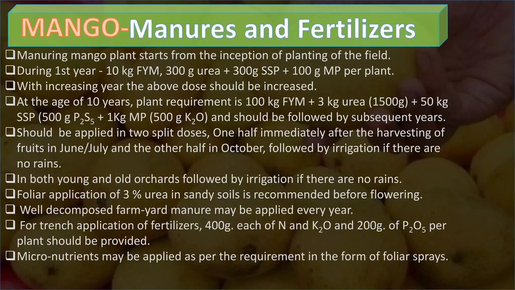 • Apply FYM and green manure before planting and after pruning.