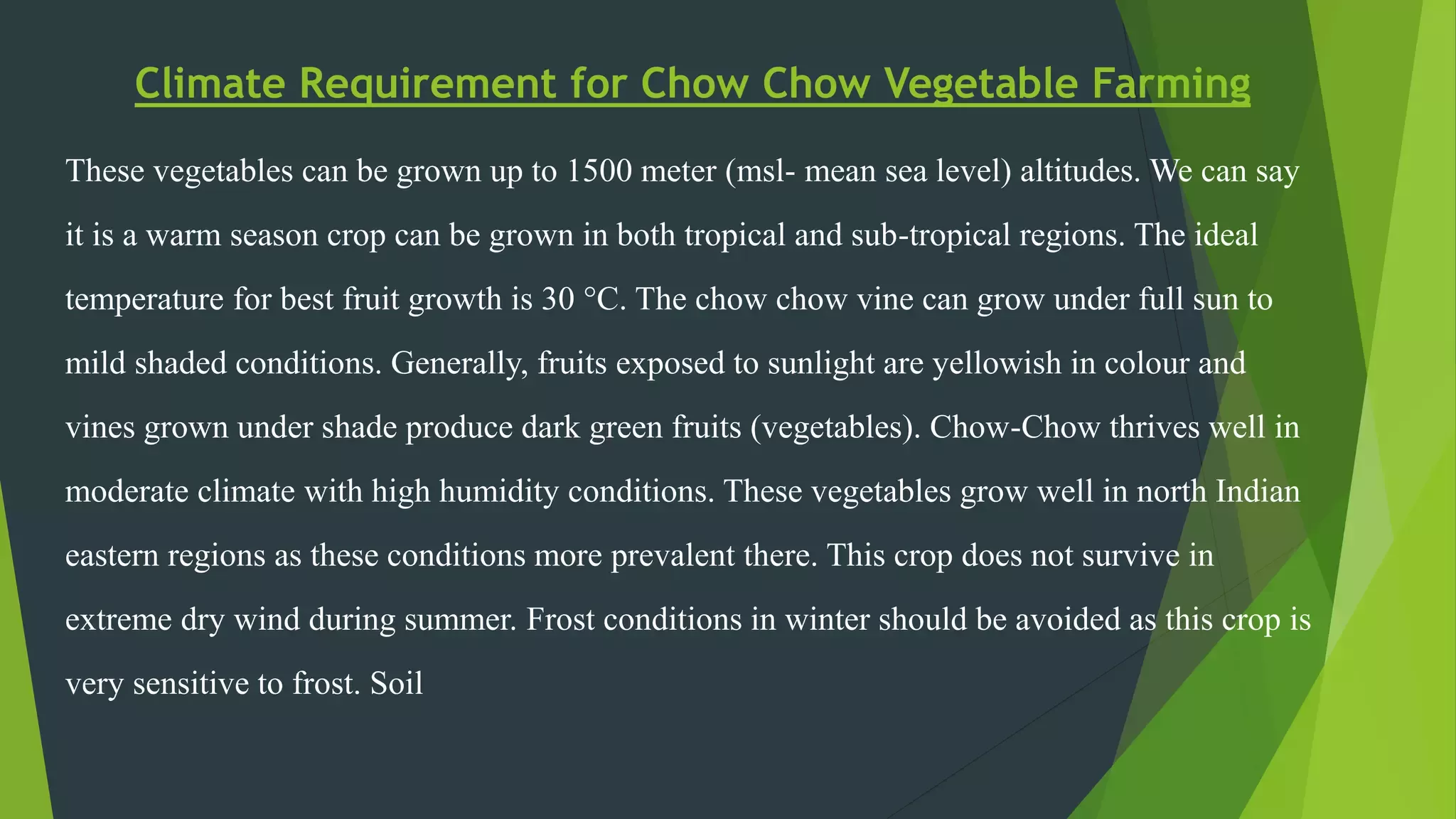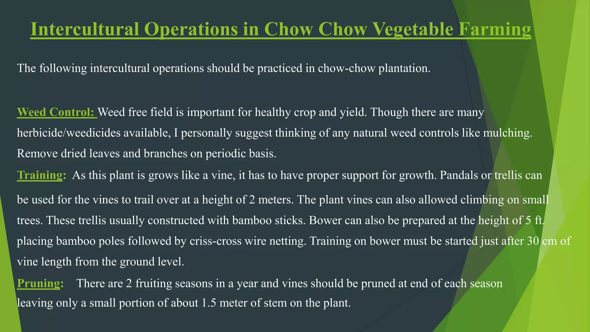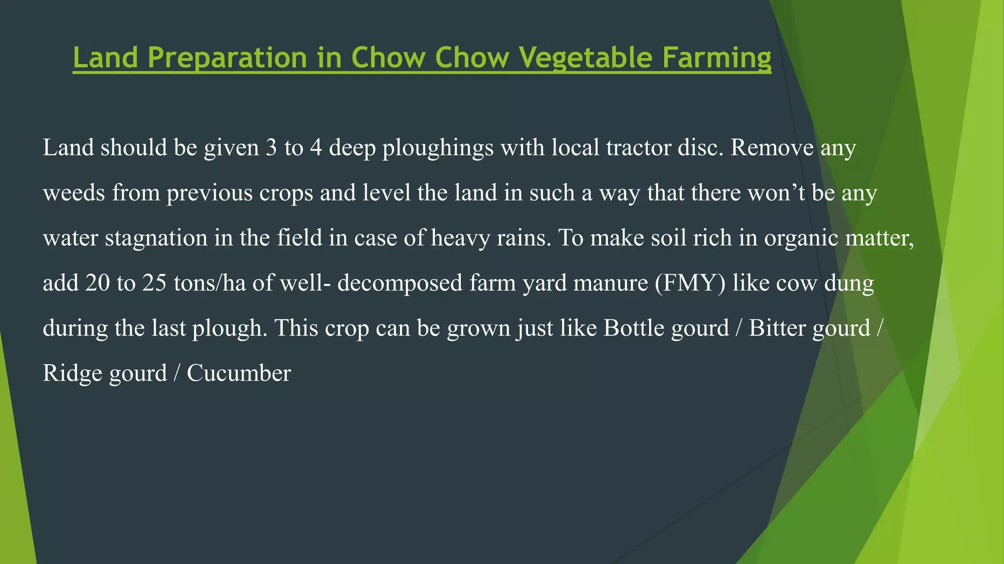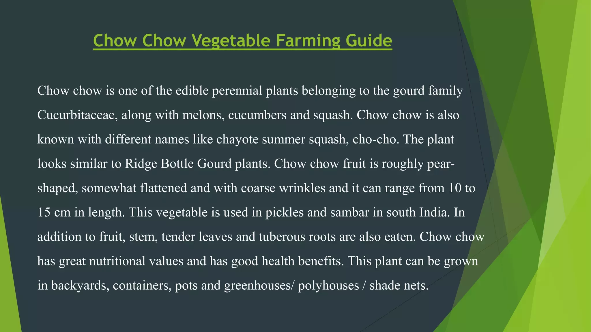 Chow Chow Vegetable: An Overview of its Attributes, Farming Practices, and Health Benefits Chow Chow, also recognized as Chayote or pear squash, is a unique edible perennial plant that belongs to the Cucurbitaceae family, which encompasses various types of gourds, melons, cucumbers, and squashes. Scientifically classified as Sechium edule, this versatile vegetable has acquired numerous names across regions and cultures, including Bengaluru venkaaya in India and Ishkus in Dargiling. The fruit of the Chow Chow plant is distinctively pear-shaped, typically measuring between 10 to 15 cm in length, with a surface that exhibits coarse wrinkles. In South India, the vegetable is commonly incorporated into local dishes such as pickles and sambar, while other parts of the plant, including the leaves and tuberous roots, are also edible, showcasing its overall utility in culinary practices. Chow Chow cultivation is gaining traction, particularly in India, where two primary varieties are recognized: white and green. While these varieties lack specific commercial designations, certain high-yielding genotypes can produce an impressive 35 to 40 kg per plant. Favorable growing conditions include warm climates characterized by high humidity, making these vegetables best suited for tropical and subtropical regions. The ideal temperature for optimal fruit growth is around 30 °C, with the plant thriving in both full sunlight and shaded areas. Soil quality is a crucial factor in Chow Chow farming, as it requires well-drained, fertile soil rich in organic matter. Although slightly tolerant to acidic soils, the pH level ideally should fall between 5.5 and 6.5. Successful cultivation also necessitates appropriate land preparation, which includes deep plowing and the addition of decomposed farmyard manure. The propagation of Chow Chow typically involves planting sprouted fruits directly into the soil, making for relatively straightforward cultivation practices. In terms of maintenance, effective irrigation is key throughout the growing season, especially during dry spells. Utilizing methods such as drip irrigation can conserve water while ensuring consistently moist soil conditions. Moreover, regular intercultural practices like weed control and proper vine training on trellises or supports are essential for promoting healthy growth and maximizing yield. Harvesting Chow Chow requires vigilance, as the vegetables must be picked before they mature fully to avoid detrimental seed development. With optimal management practices, the yield can reach remarkable levels, averaging between 80 and 100 quintals per acre. Beyond its agricultural benefits, Chow Chow is also celebrated for its remarkable health benefits. Rich in Vitamin C, fiber, and essential trace minerals, this vegetable plays a role in cancer prevention, supports digestive health, and contributes to thyroid function. Furthermore, it is known to be beneficial for heart health, aids in weight loss, and possesses anti-inflammatory properties. The increasing popularity of Chow Chow within the agricultural community and its health-promoting attributes make it a valuable addition to diets and farming practices alike. As it transitions into commercial cultivation, especially through greenhouse and polyhouse methods, Chow Chow holds promise for both farmers and consumers seeking healthy lifestyle choices. With its myriad benefits, fostering its growth can lead to rewarding outcomes in terms of both health and profitability in the agricultural sector.