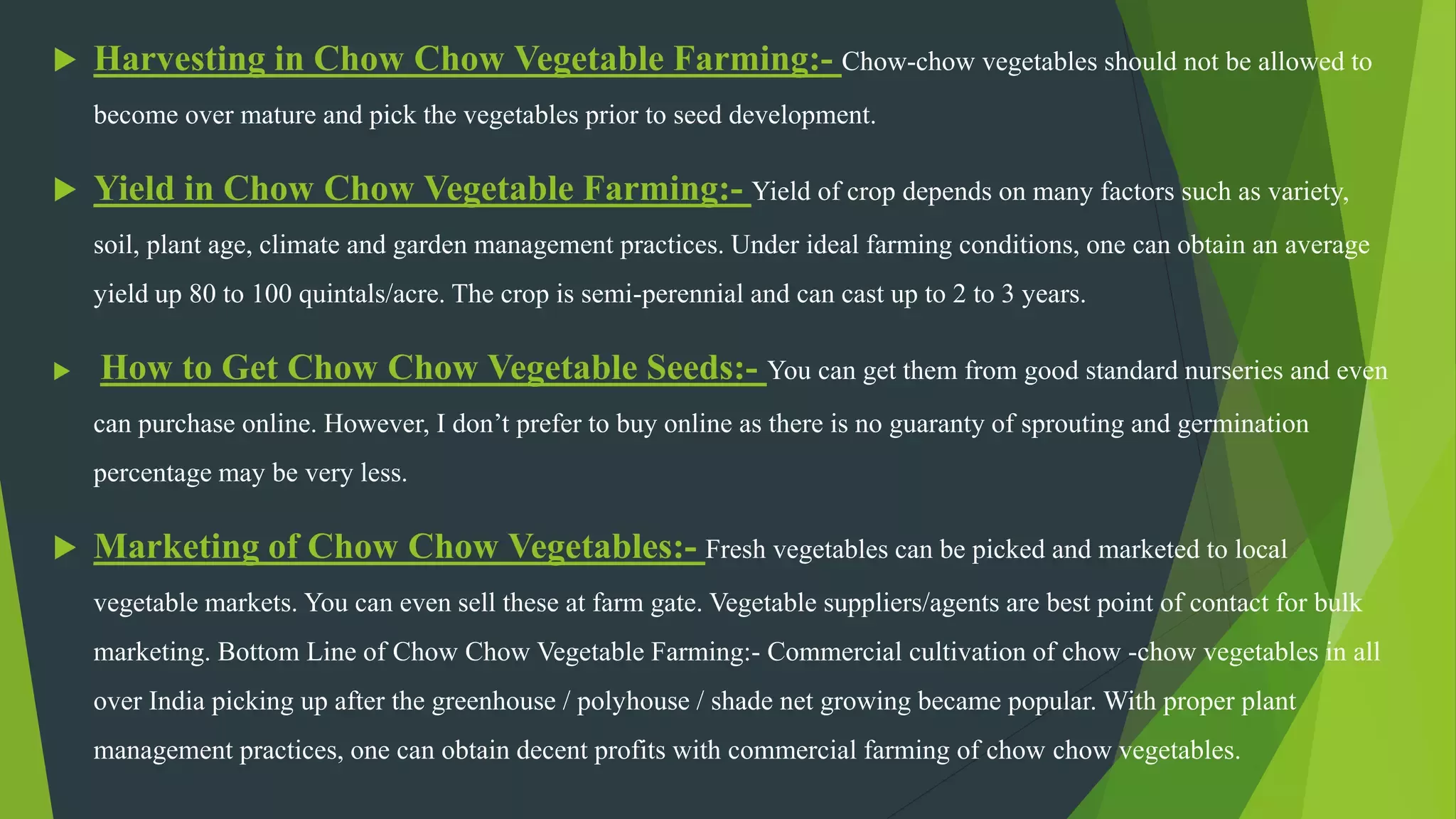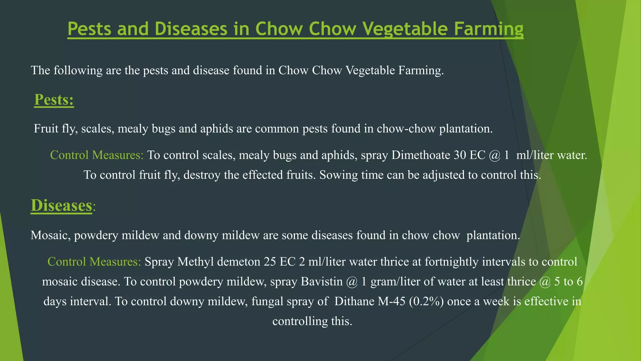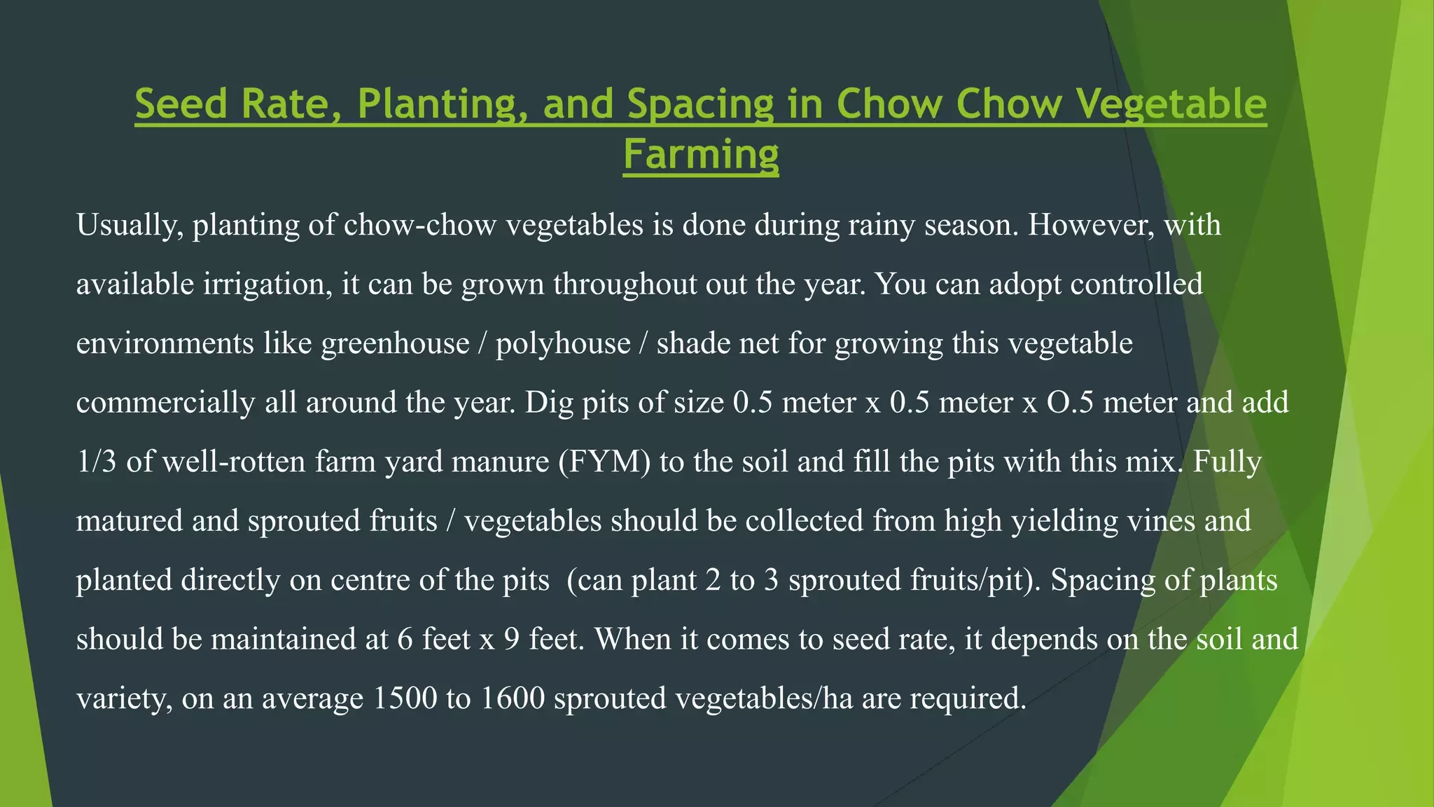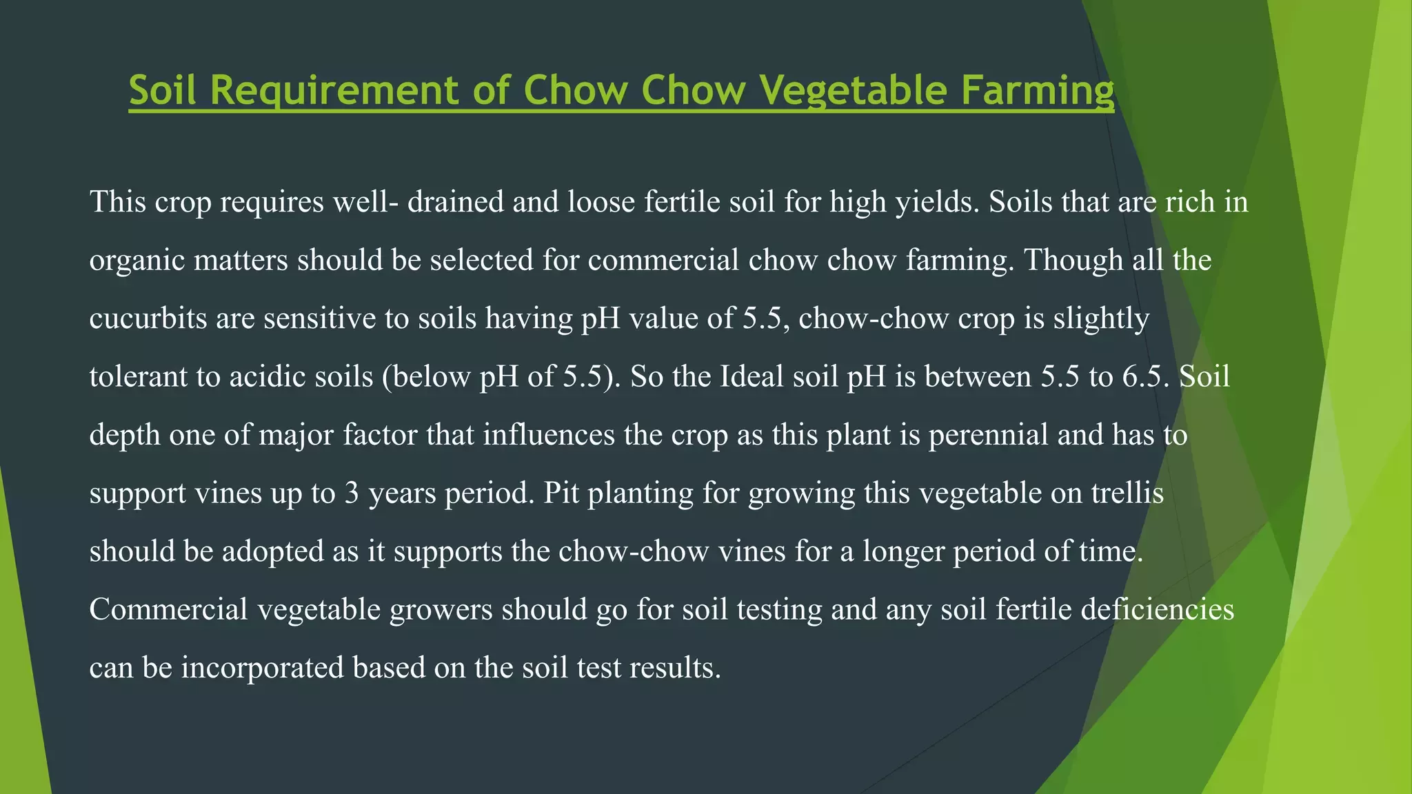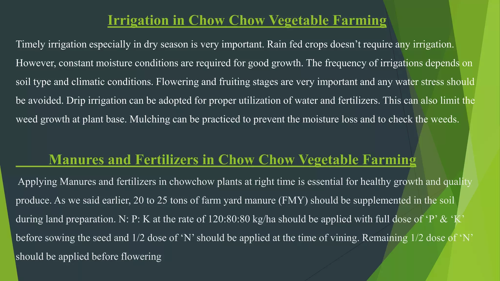 Chow Chow Vegetable: An Overview of its Attributes, Farming Practices, and Health Benefits Chow Chow, also recognized as Chayote or pear squash, is a unique edible perennial plant that belongs to the Cucurbitaceae family, which encompasses various types of gourds, melons, cucumbers, and squashes. Scientifically classified as Sechium edule, this versatile vegetable has acquired numerous names across regions and cultures, including Bengaluru venkaaya in India and Ishkus in Dargiling. The fruit of the Chow Chow plant is distinctively pear-shaped, typically measuring between 10 to 15 cm in length, with a surface that exhibits coarse wrinkles. In South India, the vegetable is commonly incorporated into local dishes such as pickles and sambar, while other parts of the plant, including the leaves and tuberous roots, are also edible, showcasing its overall utility in culinary practices. Chow Chow cultivation is gaining traction, particularly in India, where two primary varieties are recognized: white and green. While these varieties lack specific commercial designations, certain high-yielding genotypes can produce an impressive 35 to 40 kg per plant. Favorable growing conditions include warm climates characterized by high humidity, making these vegetables best suited for tropical and subtropical regions. The ideal temperature for optimal fruit growth is around 30 °C, with the plant thriving in both full sunlight and shaded areas. Soil quality is a crucial factor in Chow Chow farming, as it requires well-drained, fertile soil rich in organic matter. Although slightly tolerant to acidic soils, the pH level ideally should fall between 5.5 and 6.5. Successful cultivation also necessitates appropriate land preparation, which includes deep plowing and the addition of decomposed farmyard manure. The propagation of Chow Chow typically involves planting sprouted fruits directly into the soil, making for relatively straightforward cultivation practices. In terms of maintenance, effective irrigation is key throughout the growing season, especially during dry spells. Utilizing methods such as drip irrigation can conserve water while ensuring consistently moist soil conditions. Moreover, regular intercultural practices like weed control and proper vine training on trellises or supports are essential for promoting healthy growth and maximizing yield. Harvesting Chow Chow requires vigilance, as the vegetables must be picked before they mature fully to avoid detrimental seed development. With optimal management practices, the yield can reach remarkable levels, averaging between 80 and 100 quintals per acre. Beyond its agricultural benefits, Chow Chow is also celebrated for its remarkable health benefits. Rich in Vitamin C, fiber, and essential trace minerals, this vegetable plays a role in cancer prevention, supports digestive health, and contributes to thyroid function. Furthermore, it is known to be beneficial for heart health, aids in weight loss, and possesses anti-inflammatory properties. The increasing popularity of Chow Chow within the agricultural community and its health-promoting attributes make it a valuable addition to diets and farming practices alike. As it transitions into commercial cultivation, especially through greenhouse and polyhouse methods, Chow Chow holds promise for both farmers and consumers seeking healthy lifestyle choices. With its myriad benefits, fostering its growth can lead to rewarding outcomes in terms of both health and profitability in the agricultural sector.